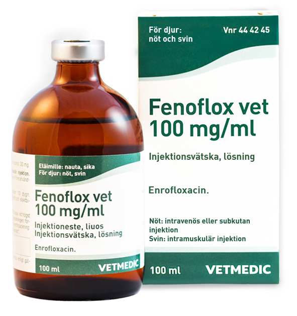 Antibiotikum av kinolontyp till nöt och svin Aktiv substans: enrofloxacin Receptbelagt läkemedel Förpackningar: 100 ml ![]() ![]() | ![]() |